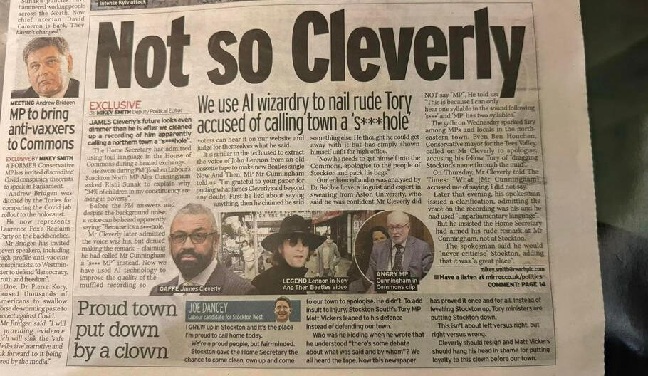 Today I wrote an article in the national press after Stockton came under attack from the Conservative government’s new Home Secretary.I am committed to stand up for Stockton so went straight out to defend it in national TV news from Yarm High Street and in the national press, as well as our local champions at BBC Tees, Teesside Live and The Northern Echo.The Mirror gave me space to defend Stockton alongside its forensic exposé of how AI technology has proven once and for all that the Home Sec said what we know he said. You can read the full piece below.This isn’t party political. We all make mistakes but it’s about our elected representatives being accountable and doing what is right.Stockton North’s Labour MP Alex Cunningham MP sprung to his feet immediately in the House of Commons to defend our town. We come from different parties but Tees Valley Mayor Lord Ben Houchen was right to condemn Mr Cleverly for “dragging Stockton’s name through the mud”.I believe that Stockton South’s former Conservative MPs Lord James Wharton and Tim Devlin would have called out such an attack on our town just as Paul Williams, Dari Taylor and Lord Ian Wrigglesworth would have done.Former MP for Stockton and Tory Prime Minister Harold Macmillan would never have let it stand. It’s a question of decency in my opinion.That’s why it’s a mystery that the current MP won’t take a stand.At the next election, the new seat of Stockton West will choose a new MP and the choice is simple.Does your candidate stand up for Stockton or not?PROUD TOWN PUT DOWN BY A CLOWNI grew up in Stockton and it’s the place I’m proud to call home today. Straddling County Durham and North Yorkshire, Stockton has a proud history and a bright future.